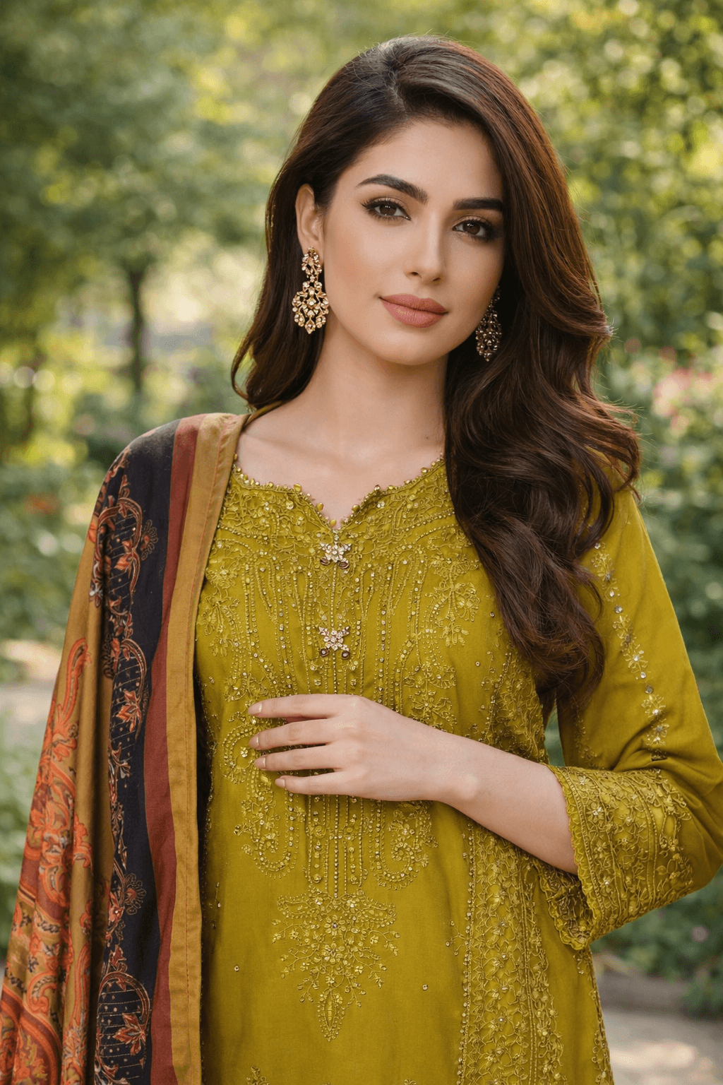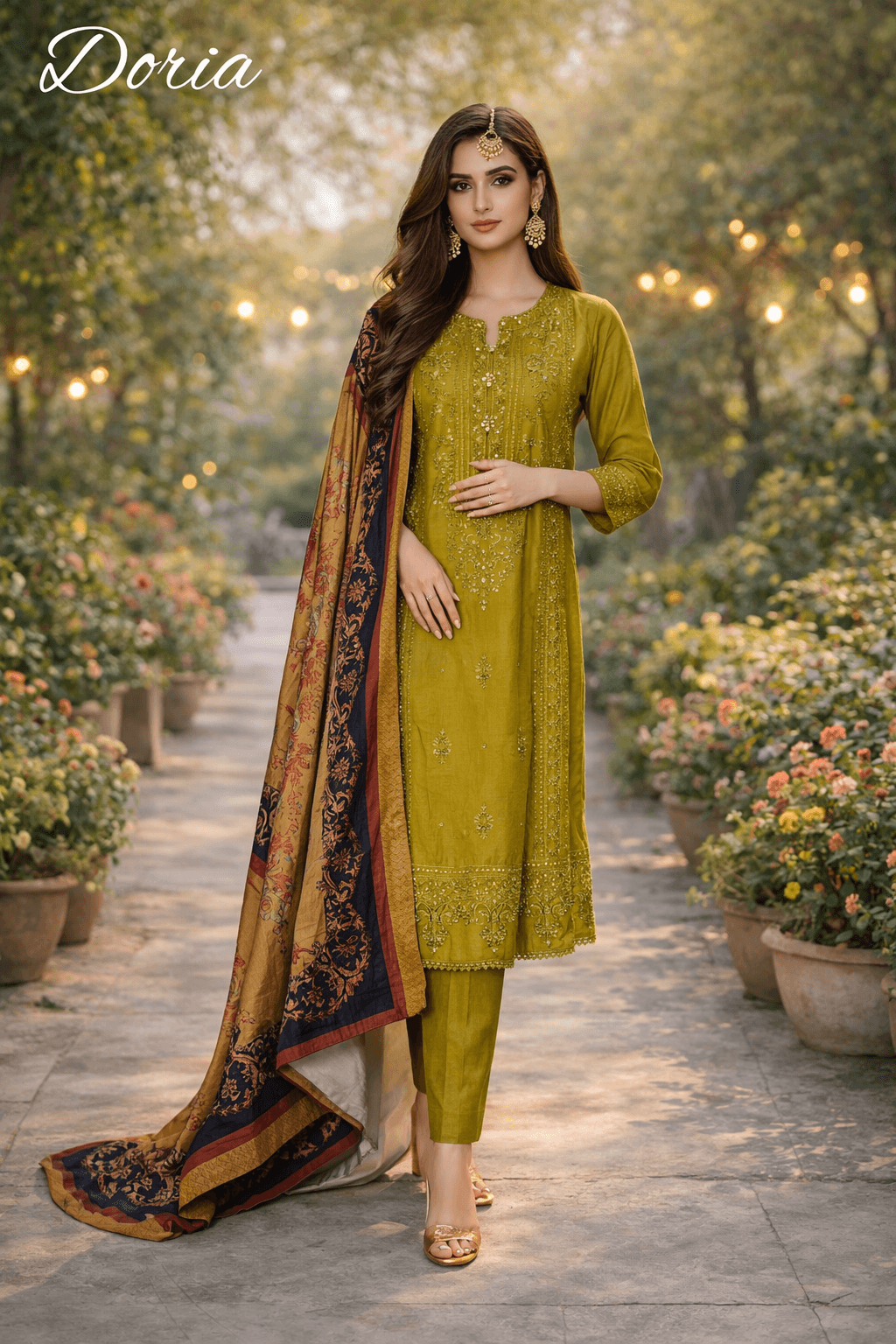 Stylish vibes in mustard‑green – perfect blend of traditional embroidery & modern flair with the Doria collection.